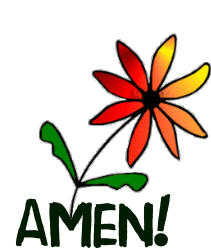 A vibrant animated flower with petals in yellow, orange, and red, accompanied by the word 'AMEN!' in green.