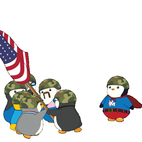 A group of adorable penguins in camo helmets raise the American flag, while another penguin in a superhero outfit watches.