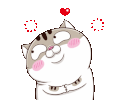 Amifatcat, a cute cartoon cat, blushes with hearts around its head, looking up with a dreamy expression.