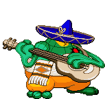 Amingo Fartcord, the green frog-like character, plays a guitar while wearing a blue sombrero, embodying a mariachi musician.