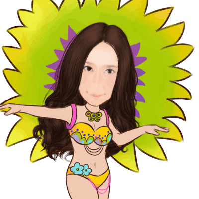 Ammy dances energetically in a vibrant yellow bikini and a large green and purple feathered headdress.