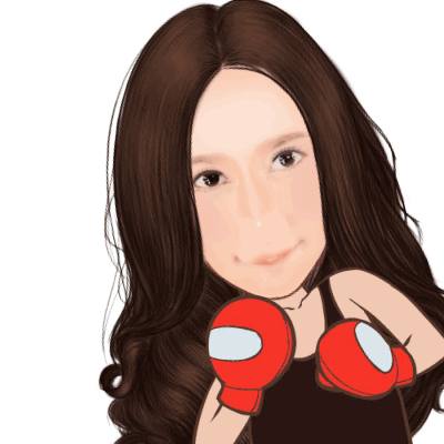 Ammy, a cartoon woman with long dark hair, poses in a boxing stance with red gloves, ready for action.