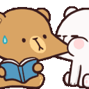 A brown bear tries to read a book while a white bear leans in for a kiss, showing affection.