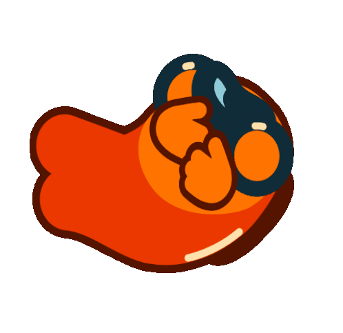 The orange Among Us Tele pet, wearing binoculars, wiggles and looks around in this animated sticker.