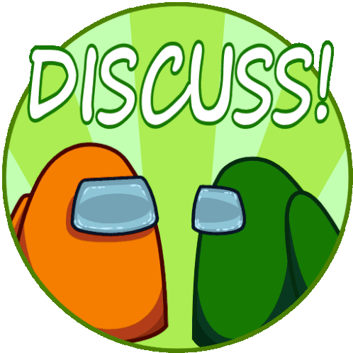 Amandarling's Among Us sticker features two crewmates, orange and green, ready to 'DISCUSS!' in a vibrant green circle.