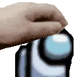 A pixel art hand holds the iconic red Among Us character, perfect for game enthusiasts.