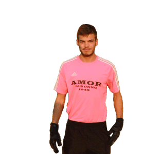 A goalkeeper in a pink jersey and gloves holds a soccer ball and pretends to talk on the phone.