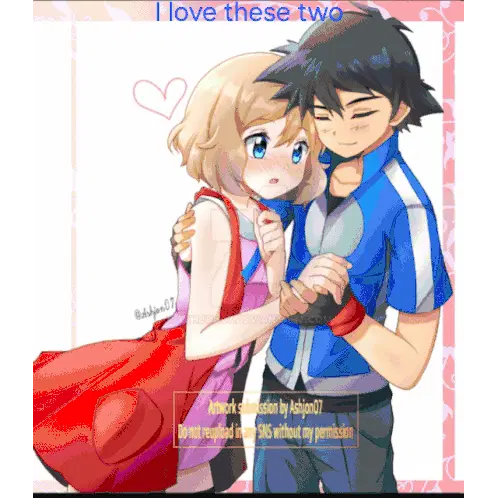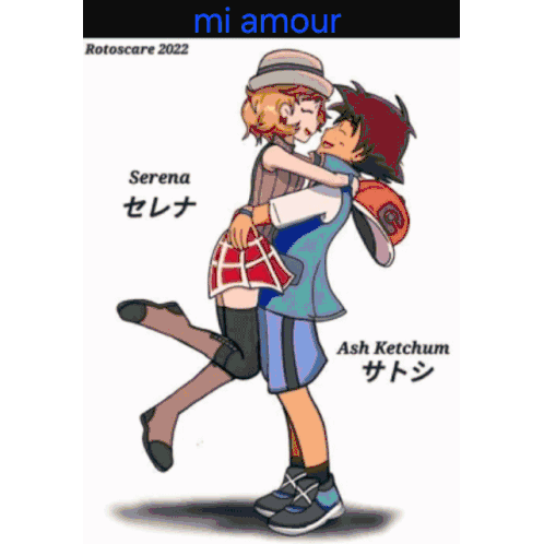 Ash Ketchum and Serena share sweet moments, holding hands and embracing, celebrating their 'mi amour' in this animated sticker.