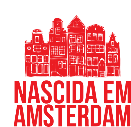 An animated sticker featuring iconic Amsterdam houses and a bicycle with flowers, with the text "Born in Amsterdam".