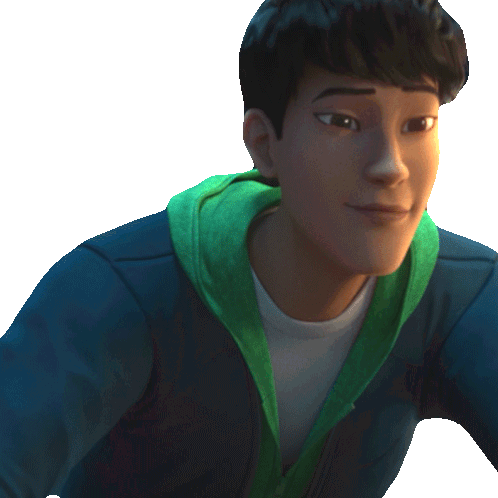 Kenji Kon from Jurassic World: Chaos Theory looks amused, resting his chin on his hand, wearing a blue jacket and green hoodie.