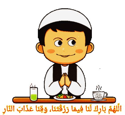 A cute Muslim child in a Kufi cap prays before eating, with a plate of food and a drink on the table.