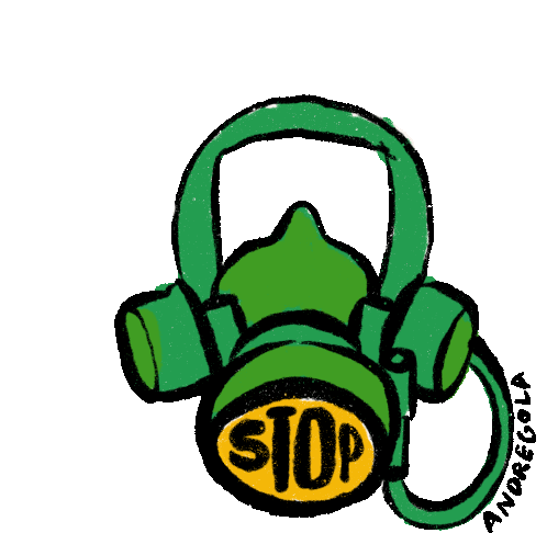 An animated green gas mask by Andregola, featuring the words 'STOP' and 'NOW' changing on its filter, conveying an urgent message.