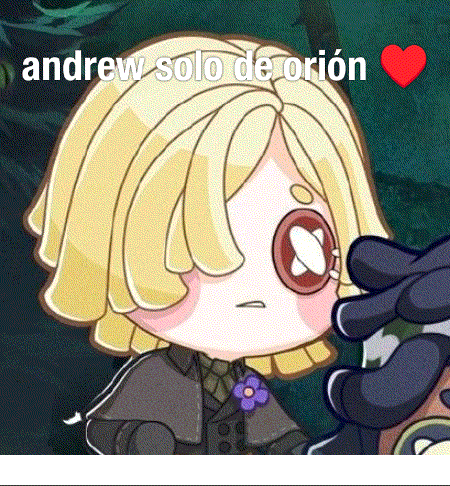 Andrew Kreiss from Identity V in a chibi style, with the caption 'Andrew solo de Orión ❤️' and a heart.