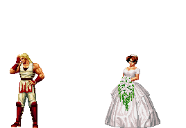 Andy Bogard reacts as Mai Shiranui transforms from a wedding dress to her classic fighting attire in this King of Fighters animation.