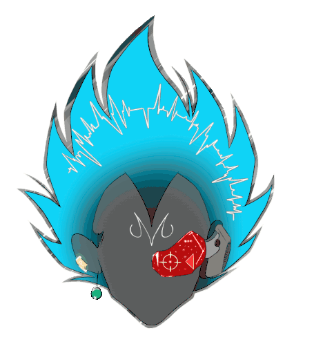 Aneix's stylized drawing of Majin Vegeta in Super Saiyan Blue form, wearing a scouter and eating a strawberry.