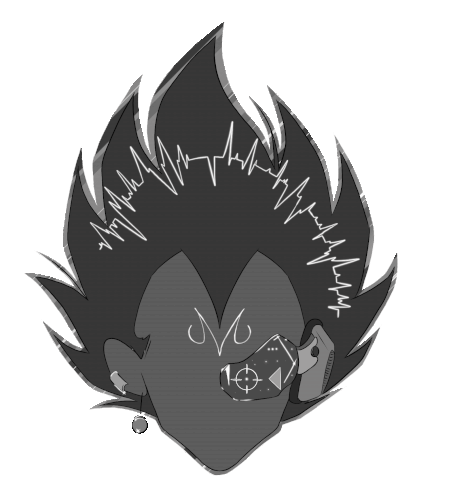 Aneix's black and white drawing of Majin Vegeta with a scouter and 'FZC-N' text in his mouth, featuring spiky hair.