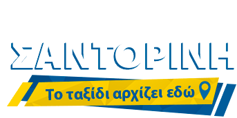 Anek Lines logo featuring 'Santorini' in Greek and the slogan 'The journey begins here' with a location pin.