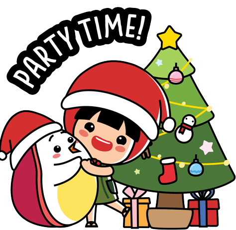 Ang Ku Kueh Girl and a friend, both in Santa hats, hug next to a festive Christmas tree with presents, celebrating 'PARTY TIME!'.