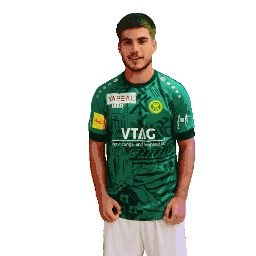 Angelo Campos, the SC Brühl footballer, celebrates with raised fists and a joyful smile in his green jersey.