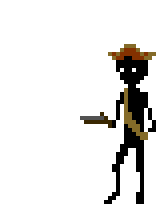 Angelo Pistola, a pixel art character, stands with a gun and a tray, wearing a straw hat.