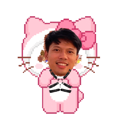 Angelo's face is superimposed on a pixelated pink Hello Kitty-like character wearing a black harness, with a heart.