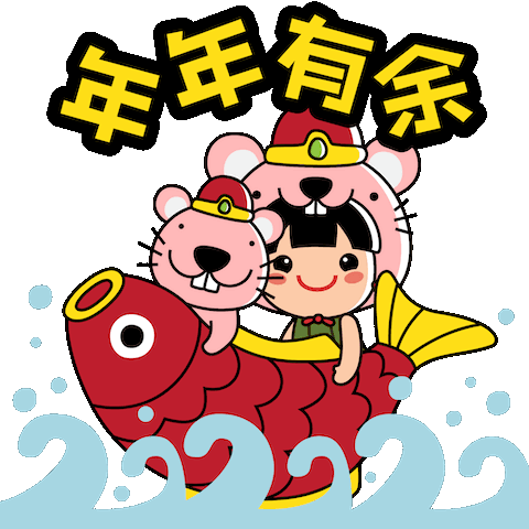 Angkukuehgirl and her rat friends celebrate Chinese New Year, riding a festive red fish with the greeting 'Abundance every year'.