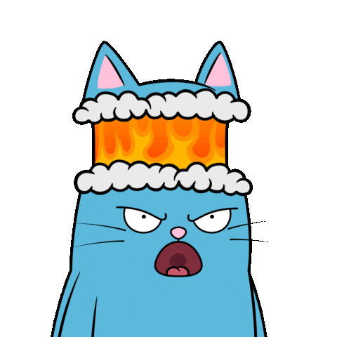 An intensely angry blue cartoon cat with a flaming cake on its head, yelling in fury and frustration.