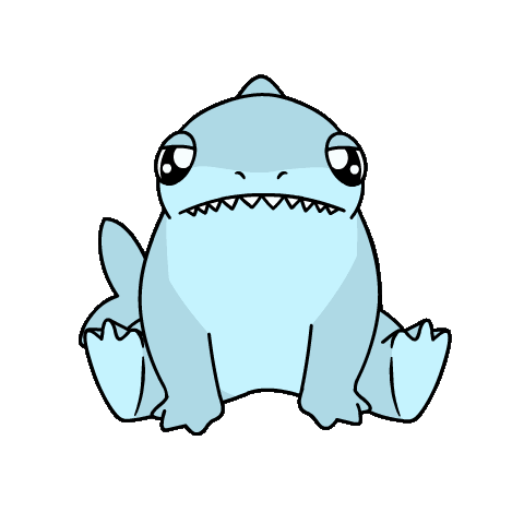 An angry and annoyed cartoon shark with big eyes and sharp teeth, sitting with a red ball of yarn.