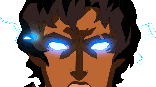Heron from Blood of Zeus, with intense glowing blue eyes and crackling lightning, showing his powerful fury.