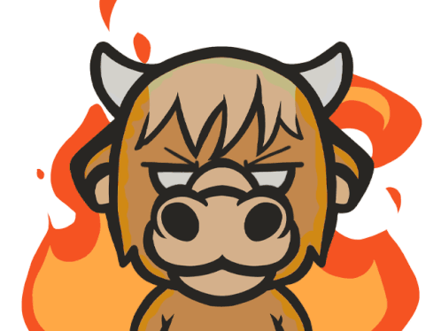 An animated sticker featuring an angry little cow with a determined expression, surrounded by fiery flames.