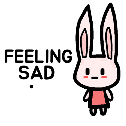 A cute cartoon bunny with long ears and a red dress expresses sadness with the animated text 'FEELING SAD'.