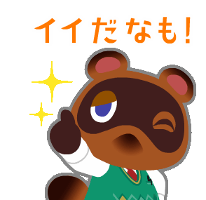 Tom Nook from Animal Crossing winks and gives a thumbs up with sparkles, saying 'It's good, nyo!' in Japanese.