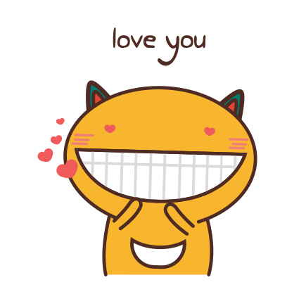 A cheerful yellow cartoon kitty with a wide smile and hearts floating around it expresses 'love you'.