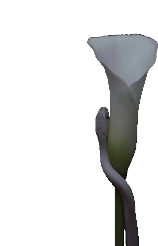 A white snake gracefully coiled around a pristine white calla lily, representing the Animals As Leaders band aesthetic.