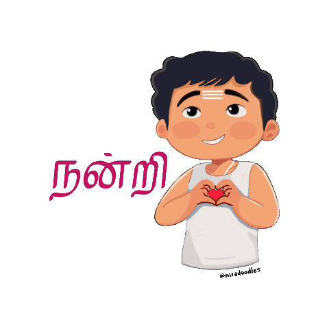 An Animatedambi Brahmin boy expresses gratitude by forming a heart with his hands, with the Tamil word 'Nandri' (Thanks) beside him.