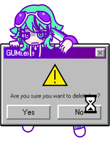 a girl with green hair and purple goggles is peeking over a warning sign that asks if you want to delete