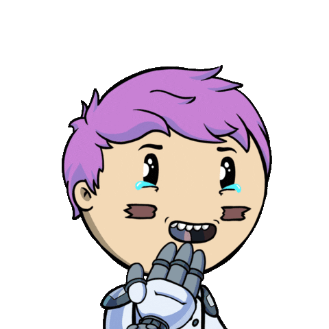 A purple-haired cartoon character sheds happy tears, expressing overwhelming joy with a wide smile and visible emotion.
