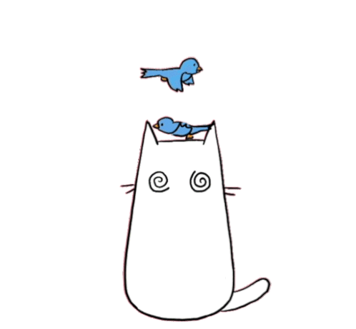 A dizzy white cartoon cat with swirly eyes watches two blue birds, then its eyes open wide, and it eats them with a satisfied look.