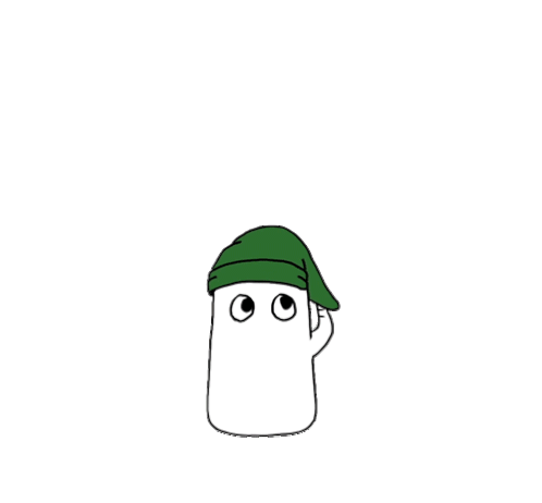 A white, blob-like character in a green hat, resembling Link, holds and then lowers a sword.