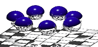 Animated blue, shiny, reflective spheres bounce on a checkered grid, showcasing early computer graphics.