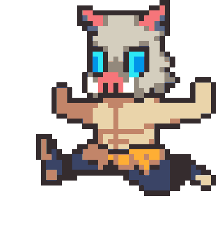 Inosuke from Demon Slayer (Kimetsu No Yaiba) in a dynamic pixel art running pose, showcasing his iconic boar mask.