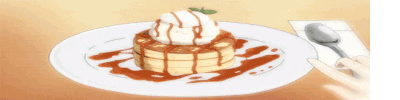 a person is holding a spoon next to a plate of pancakes and ice cream .
