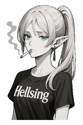 a girl with a ponytail is smoking a cigarette and wearing a shirt that says hellsing