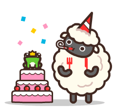 A cute kawaii sheep in a party hat celebrates a birthday with a tiered cake, a frog, and confetti.