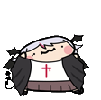 Cute chibi anime character with bat wings and a cross, wiggling shyly with a loving expression.
