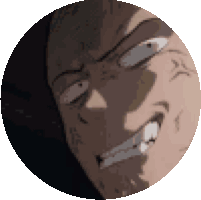 A close-up of Saitama from One-Punch Man with a menacing, gritted-teeth expression in a circular frame.