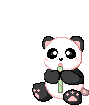 A cute pixel art anime panda sits and happily eats a green bamboo stick, perfect for a sticker.