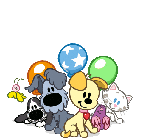 A group of adorable cartoon animals including dogs, a cat, and a butterfly, celebrating with colorful balloons.