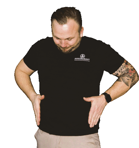 Stefan Ankerkraut, wearing an Ankerkraut shirt, makes a playful "no" gesture, embodying the Ankerkrautliebe spirit.