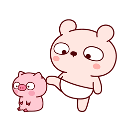 A light pink cartoon bear in a diaper looks annoyed, raising its leg as if to kick a small, surprised pink pig.